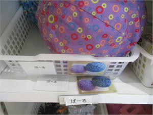 子どもたちのアイディアで、ペットボトルに水と絵の具を入れて、カラフルなピンが完成しました。ボールは新聞紙と画用紙でできた”アンパンマンボール”です。